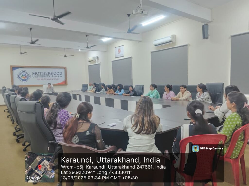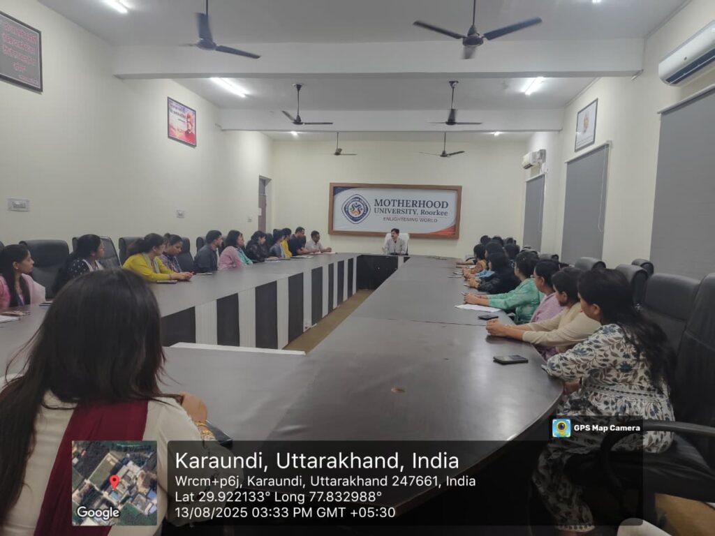 दिनांक: १३/०८/२०२५ को मदरहुड आयुर्वेद मेडिकल कालेज के डायरेक्टर जनरल प्रोफेसर डॉ. नरेंद्र शर्मा सर के द्वारा स्वतंत्रता दिवस समारोह और तिरंगा रैली की तैयारियों की समीक्षा के लिए एक बैठक का आयोजन किया गया। इस बैठक में प्रिंसिपल प्रोफेसर डॉ मयंक जैन सर, वाइस प्रिंसिपल प्रोफेसर डॉ पीयूष कपिल, एवं अन्य सभी वरिष्ठ शिक्षक और संकाय सदस्य उपस्थित थे।
